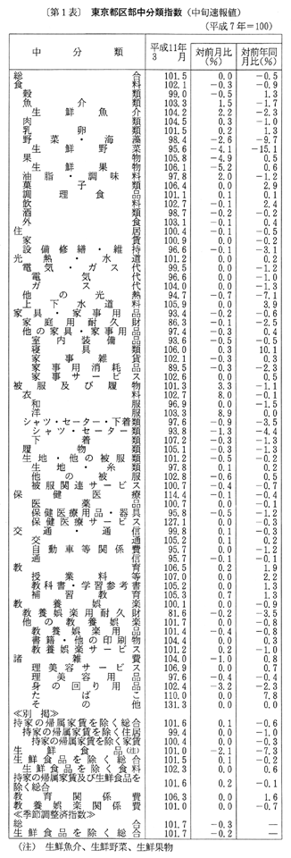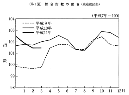 (1) 総合指数は平成七年を一〇〇として一〇一・五となり、前月と同水準。前年同月比は十二月〇・八%の上昇、一月〇・一%の上昇、二月〇・二%の下落と推移した後、三月は〇・五%の下落となった。