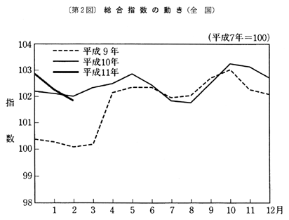 (1) 総合指数は平成七年を一〇〇として一〇一・九となり、前月比は〇・四%の下落。前年同月比は十一月〇・八%の上昇、十二月〇・六%の上昇、一月〇・二%の上昇と推移した後、二月は〇・一%の下落となった。