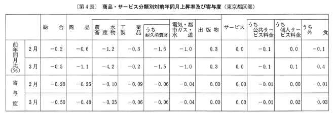 (2) 生鮮食品を除く総合指数は一〇一・五となり、前月比は〇・一%の上昇。前年同月比は十二月から二月までそれぞれ〇・一%の下落で推移した後、三月は〇・二%の下落となった。