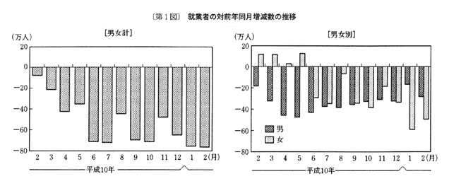 完全失業者数は三百十三万人で、前年同月に比べ六十七万人(二七・二%)増加し、比較可能な昭和二十八年以降で最多となっている。男女別にみると、男性は百八十九万人、女性は百二十四万人で、男女共に昭和二十八年以降で最多となっている。前年同月に比べると、男性は三十八万人(二五・二%)の増加、女性は二十九万人(三〇・五%)の増加となっている。