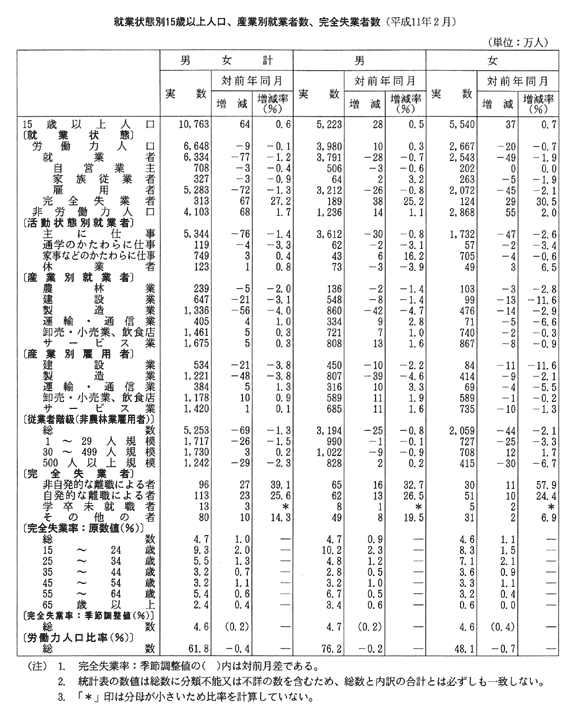 また、十五〜六十四歳人口は八千六百七十七万人で、前年同月に比べ八万人(〇・一%)の減少となっている。これを就業状態別にみると、就業者は五千八百九十七万人、完全失業者は三百二万人、非労働力人口は二千四百六十九万人で、前年同月に比べそれぞれ七十六万人(一・三%)減、六十五万人(二七・四%)増、一万人(〇・〇%)増となっている。