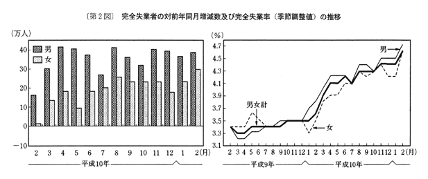 完全失業率(労働力人口に占める完全失業者の割合)は四・七%で、前年同月に比べ一・〇ポイントの上昇となっている。男女別にみると、男性は四・七%、女性は四・六%で、前年同月に比べ男性は〇・九ポイント、女性は一・一ポイントの上昇となっている。