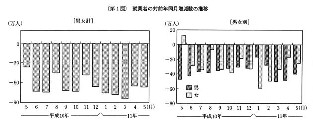 雇用者数は、一九九八年平均で五千三百六十八万人、前年差二十三万人減と、比較可能な一九五四年以降で初めて前年より減少した。これは、例年は新規入職者を中心に雇用者数が大幅に増える春先に、入職抑制が厳しく行われたことが大きく影響した。