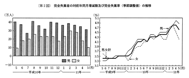 完全失業率は一九九八年二〜四月にかけて、第一次石油危機後に匹敵する急激なペースで上昇し、四月には現行の統計調査開始以来、初めて四%を超え、年平均でも四・一%(前年差〇・七%ポイント上昇)となった。男性四・二%、女性四・〇%と、男女ともこれまでにない高さとなった。月別にみると、二〜四月にかけて急上昇した後、五月以降はいったん緩やかな上昇となったが、一九九九年二月以降、再び上昇幅が拡大し、三月には四・八%(男女とも四・八%)となった。