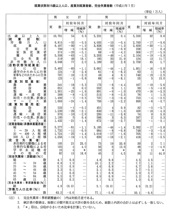平成十一年七月末の十五歳以上人口は一億七百八十一万人で、前年同月に比べ五十四万人(〇・五%)の増加となっている。これを就業状態別でみると、就業者は六千四百九十七万人、完全失業者は三百十九万人、非労働力人口は三千九百四十八万人で、前年同月に比べそれぞれ八十万人(一・二%)減、四十九万人(一八・一%)増、七十七万人(二・〇%)増となっている。