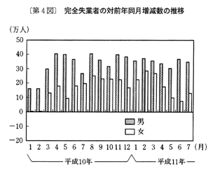 完全失業率(労働力人口に占める完全失業者の割合)は四・七%で、前年同月に比べ〇・八ポイントの上昇となっている。男女別にみると、男性は四・八%、女性は四・五%で、前年同月に比べ男性は〇・八ポイント、女性は〇・五ポイントの上昇となっている。