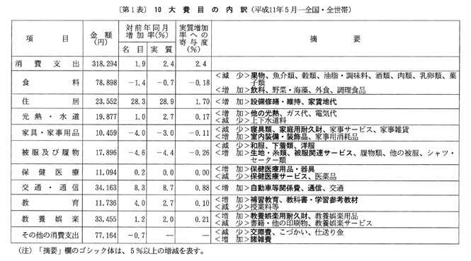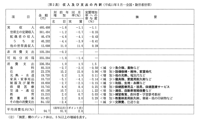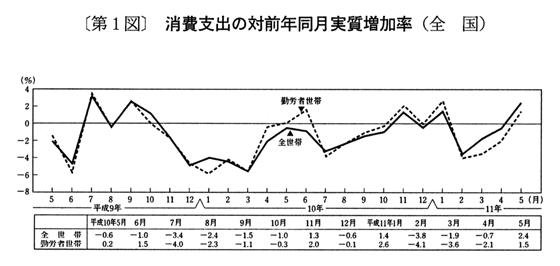 全世帯の消費支出は、平成十年十一月は実質増加、十二月は実質減少、十一年一月は実質増加となった後、二月以降三か月連続の実質減少となり、五月は実質増加となった。
