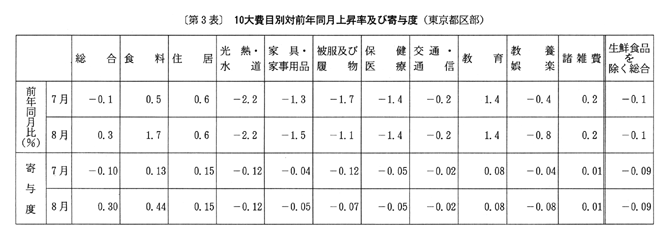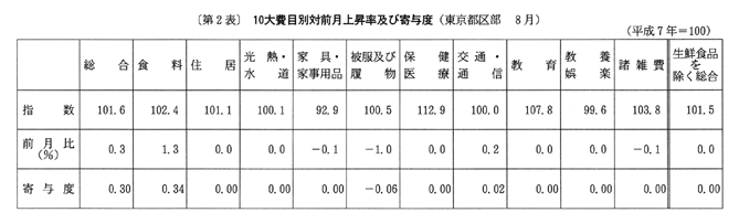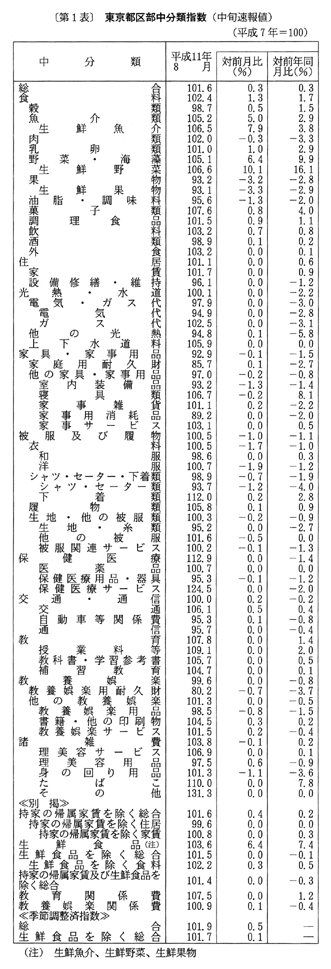 (1) 総合指数は平成七年を一〇〇として一〇一・六となり、前月比は〇・三%の上昇。前年同月比は五月〇・六%の下落、六月〇・四%の下落、七月〇・一%の下落と推移した後、八月は〇・三%の上昇となった。