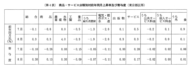 (2) 生鮮食品を除く総合指数は、一〇一・五となり、前月と同水準。前年同月比は五月〇・二%の下落、六月〇・一%の下落、七月〇・一%の下落と推移した後、八月は〇・一%の下落となった。