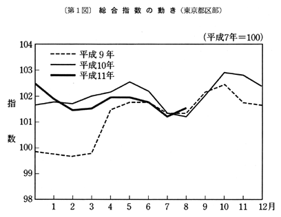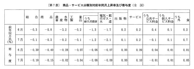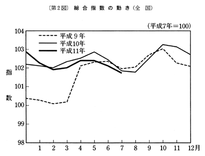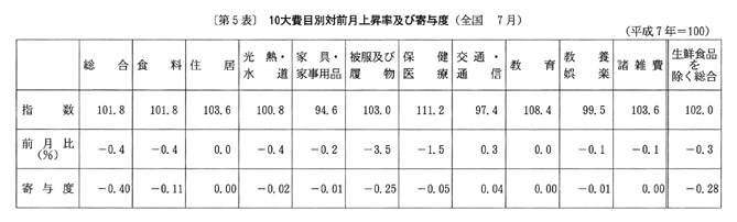 (1) 総合指数は平成七年を一〇〇として一〇一・八となり、前月比は〇・四%の下落。前年同月比は四月〇・一%の下落、五月〇・四%の下落、六月〇・三%の下落と推移した後、七月は〇・一%の下落となった。