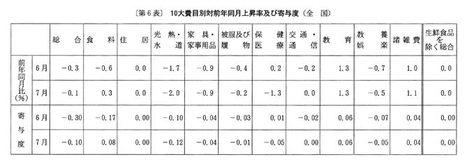 (2) 生鮮食品を除く総合指数は一〇二・〇となり、前月比は〇・三%の下落。前年同月比は四月〇・一%の下落、五月〇・〇%、六月〇・〇%と推移した後、七月は〇・〇%となった。