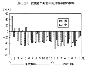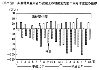 ○臨時雇…五百十九万人で、三十万人(六・一%)増、平成八年九月以降、増加が継続
