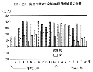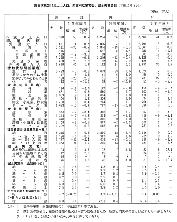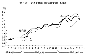 完全失業率(労働力人口に占める完全失業者の割合)は四・七%で、前年同月に比べ〇・四ポイントの上昇となっている。男女別にみると、男性は四・八%、女性は四・六%で、前年同月に比べ男女ともに〇・四ポイントの上昇となっている。