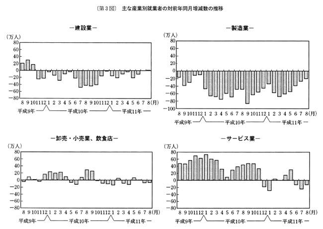 ○サービス業…一千四百二十二万人で、八万人(〇・六%)減、三か月連続で減少、減少幅は前月(二十一万人減)に比べ縮小