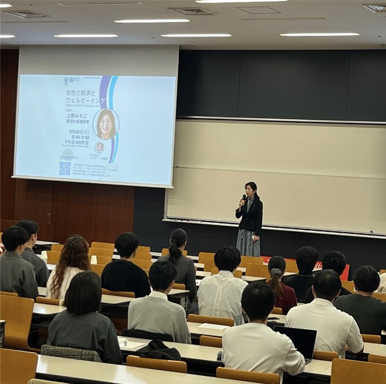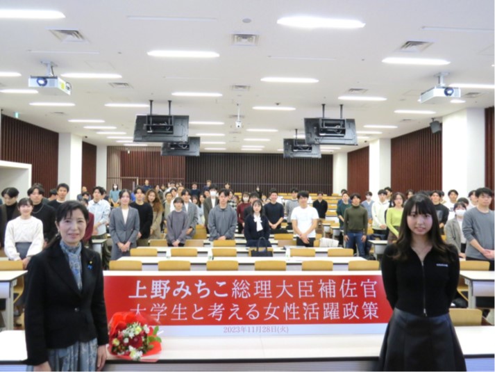 令和5年11月28日(火)、上野通子総理大臣補佐官は、早稲田大学本キャンパスにおいて、商学部の国際教育プログラム(Global Management Program)参加学生による「女性と経済とウェルビーイング」をテーマとしたプレゼンテーションを視察しました。5つのグループから「学生アンケートから見る、持ちたい子どもの数に影響を与える要因」、「低用量ピル服用と女性の社会活躍」、「PLを活用した中小企業の女性支援促進の提案」、「ESG投資指標への育児支援KPI導入の是非」、「みんなで支える従業員子育て保険の提案」をテーマとする発表があり、上野総理補佐官からは、「政策に活かせるアイデアも多く、熱意を持って課題にチャレンジする取組に感銘した」とのコメントが述べられました。