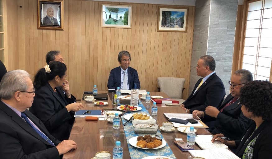 4月26日、石原宏高内閣総理大臣補佐官(国家安全保障に関する重要政策及び核軍縮・不拡散問題担当)は、我が国に大使館を設置している太平洋島嶼国7か国(トンガ王国、ミクロネシア連邦、サモア独立国、パプアニューギニア独立国、マーシャル諸島共和国、パラオ共和国、フィジー共和国)の駐日大使グループと面会しました(ただし、所用のため、パプアニューギニア独立国からは臨時代理大使が出席、フィジー共和国は欠席。)。