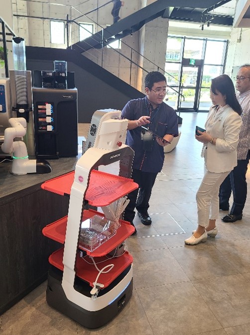 フロントで出迎えたロボットが顔認証で対応する様子や、レストラン等においてドリンクや料理を人が介在せず届ける様子、客室でのDXの活用状況などを、実際に拝見しました。