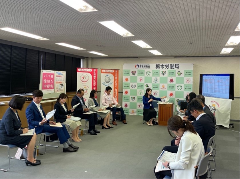栃木県は、今回、男女間賃金格差が最も大きな県とされましたが、一方で、女性も含め賃金水準が相対的に高い県でもあり、国内有数の製造業が立地する経済力の高い地域です。車座においては、改めて、地域の関係者と、正社員の割合や勤続年数などについて男女間に格差が生じていること等の実態を共有しました。また、各企業や団体におけるアンコンシャス・バイアス解消への取組や、女性の職域拡大、管理職登用への積極的な取組をお伺いしました。