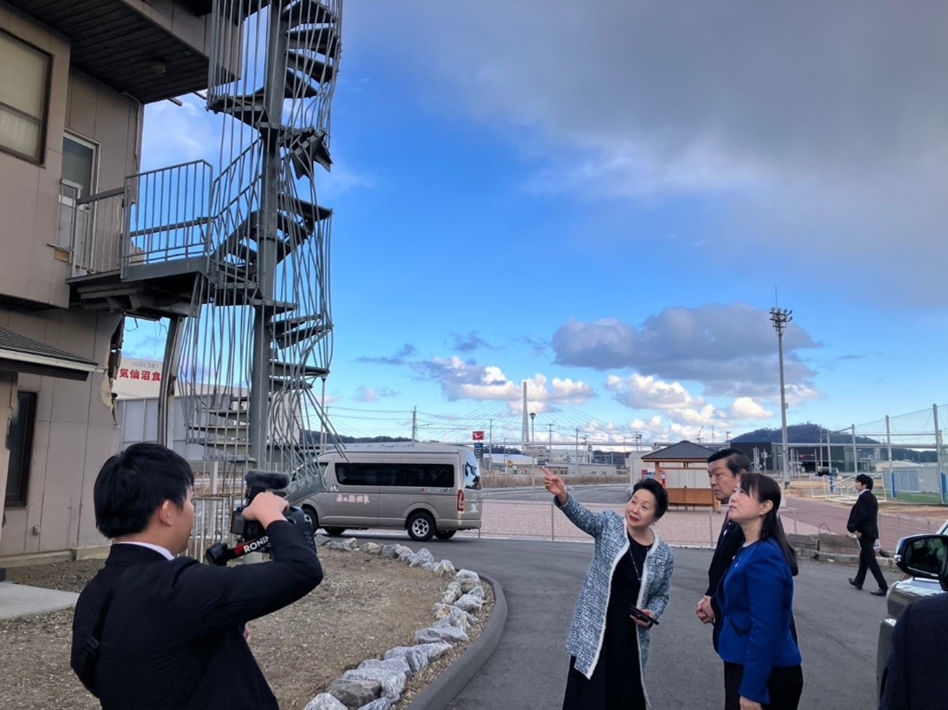 矢田補佐官は、南三陸ホテル観洋の阿部憲子女将に御案内いただき、東日本大震災において津波から逃れた約30名の方の命を救った「命のらせん階段」を視察しました。この階段は、1960年のチリ地震の津波での教訓をもとに、家屋の屋上を避難所として用いることができるよう設置されたものです。震災の教訓を伝承するための施設として今も保存されている経緯についてお話を伺いました。