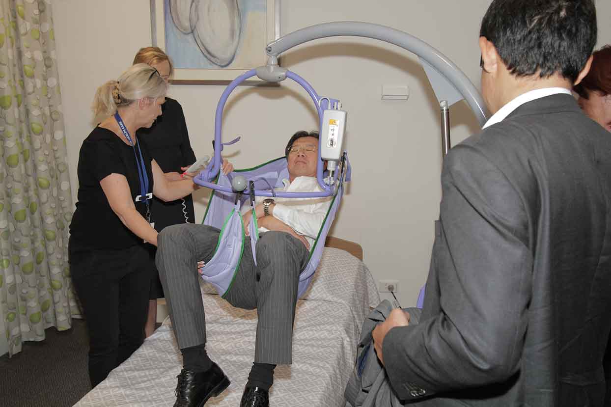 また、ビクトリア州では、介護士の腰痛対策としてノーリフトプログラムが導入され、「持ち上げない看護・抱え上げない介護」が推進されています。ノーリフトで使用される福祉用具を体験しました。