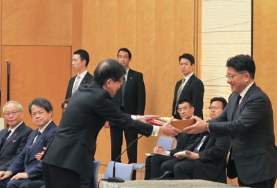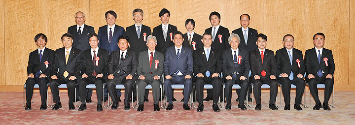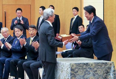 | 安倍内閣総理大臣による御挨拶 | 安倍内閣総理大臣より記念楯を授与される 小川誠二東北福祉大学感性福祉研究所特任教授 |