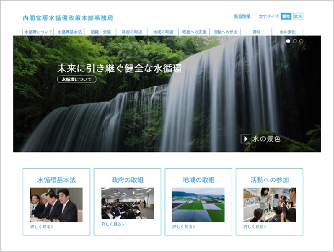 内閣官房水循環政策本部事務局は、水循環に関する政府の取組や、各地域における活動を写真や図を交えてわかりやすく開示したウェブサイトを新たに立ち上げました。