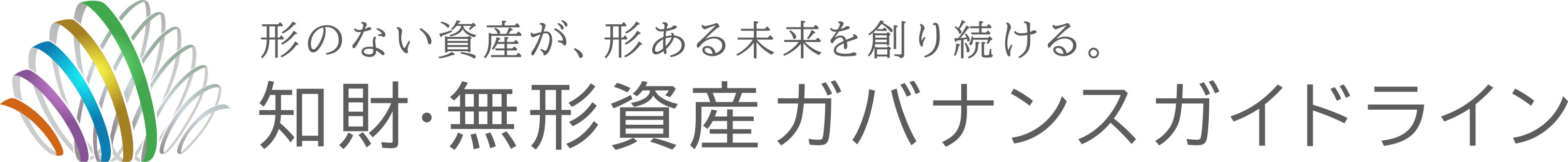 形のないものをリボンが包み込むことで、知財・無形資産の存在を表出させた様子を、シンボルとしてデザインしています。また、本ガイドラインの「5つのプリンシプル」を表すオレンジ、パープル、ブルー、ブラウン、グリーンのリボンは、知財・無形資産の投資活用戦略のために、組織の壁を越えて人々の想いと対話をつないでいく事の重要性を表現しています。