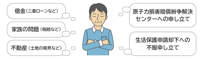 | ● | また、二重ローンの問題や原発問題の賠償請求など、震災を原因とした法的問題について、裁判などで弁護士や司法書士が代理人となって解決を図ったり、その手続に必要な書類を作成するなどの支援をしています。 ※なお、弁護士・司法書士などの費用は、無利子で立て替えています。 |