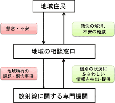 住民の方からのさまざまな疑問・不安・課題を受けとめて、適切な情報を提供し、懸念の解消や不安の軽減につなげるには、地域ごとの「相談窓口」が有効であると考えられます。ここに相談をすれば、放射線の量や影響に伴う“私の”不安に対する答えが見つかる、“地域の”状況に応じた対応策が見つかる、そのような相談窓口です。